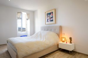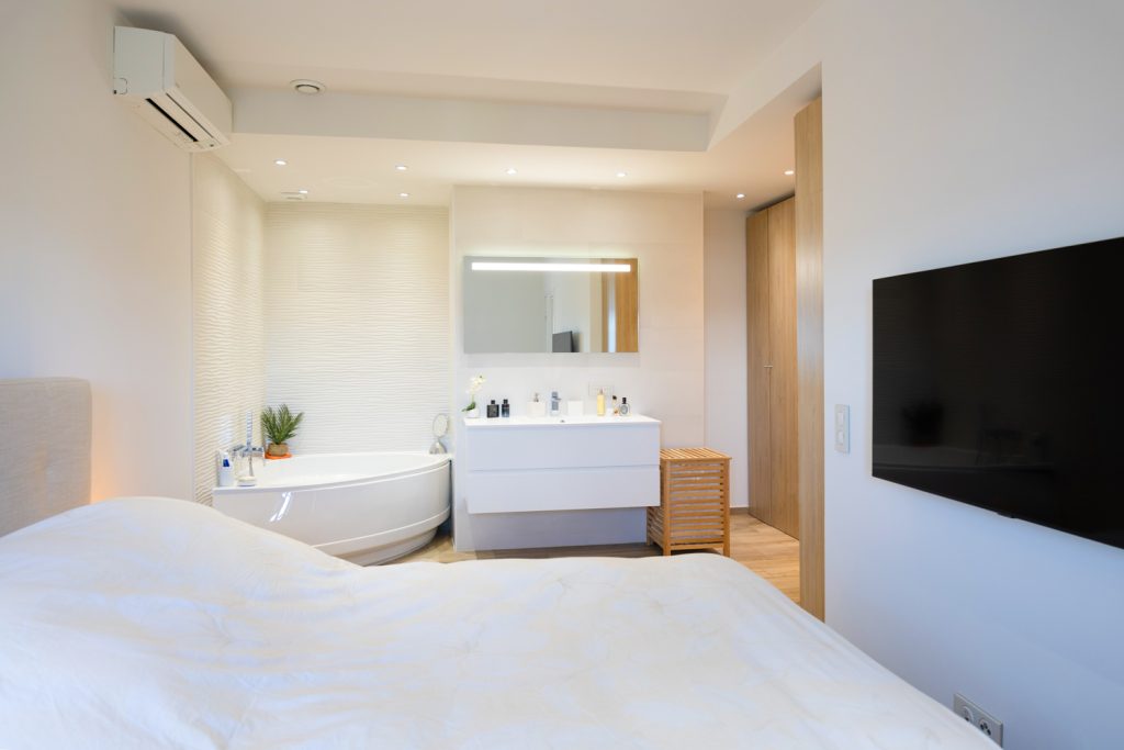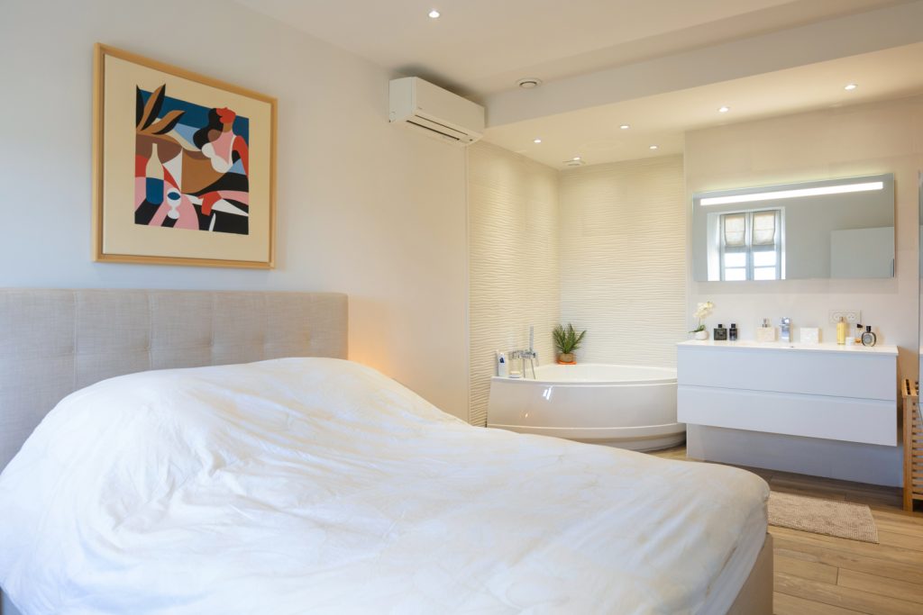 Het appartement beschikt over een prachtige en-suite slaapkamer met eigen badkamer, een ruime kast en zelfs een aparte wasruimte. Daarnaast is er nog een tweede slaapkamer met een kast, een aparte doucheruimte en een gastentoilet. De renovatie heeft gezorgd voor mooie volumes en hoogwaardige afwerkingen, wat bijdraagt aan het comfort en de luxe van de woning.