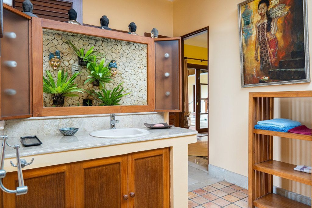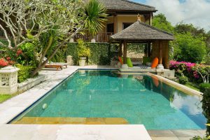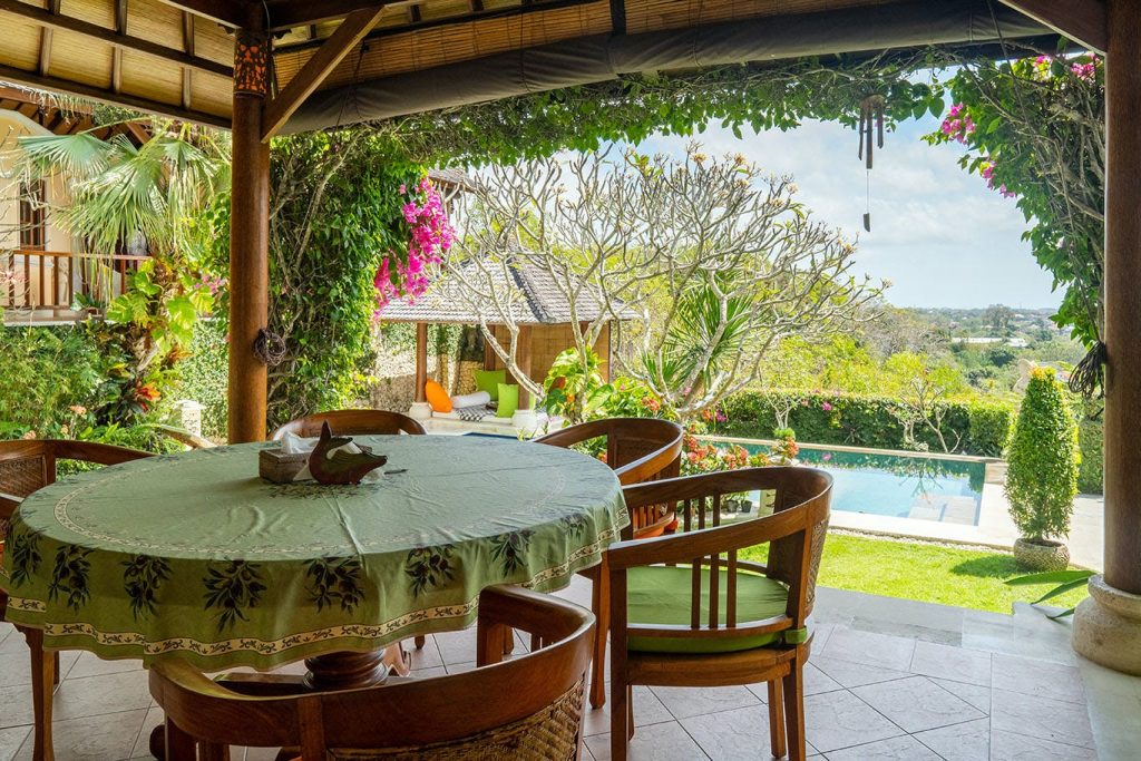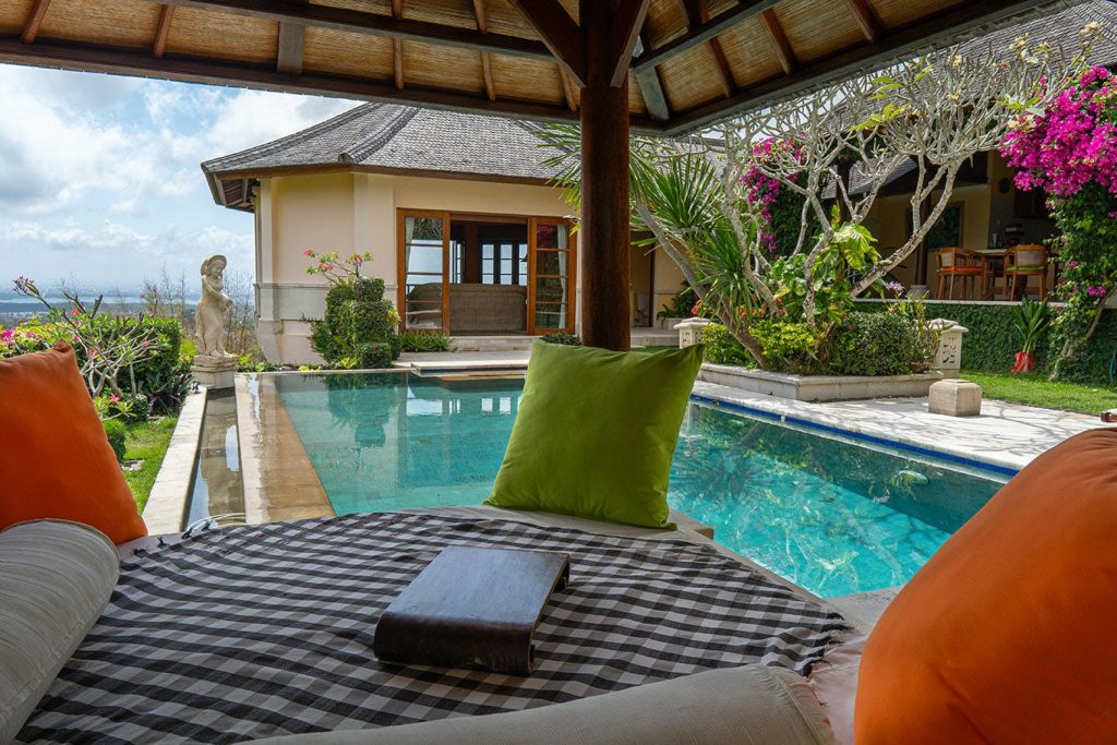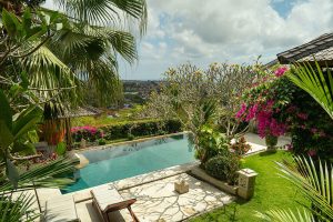 Het pand is verder uitgerust met een royaal zwembad, een fraaie aangelegde tuin met vele stijldetails en een buitenzitgedeelte met adembenemende zichten op de omliggende bergen, de Zuidkust van Bali en Nusa Penida.