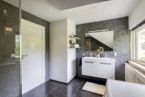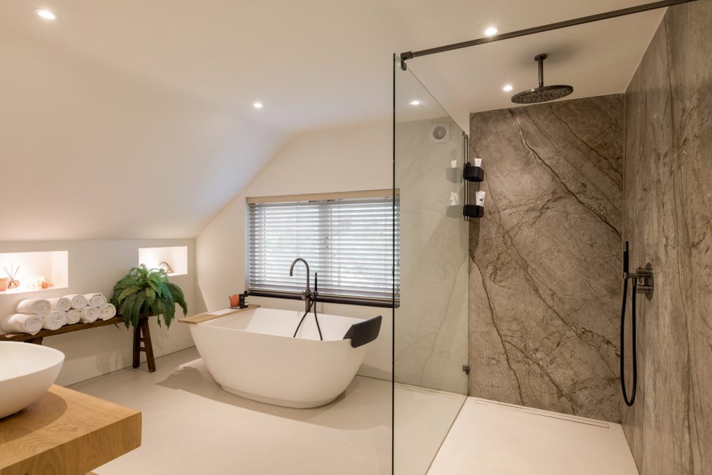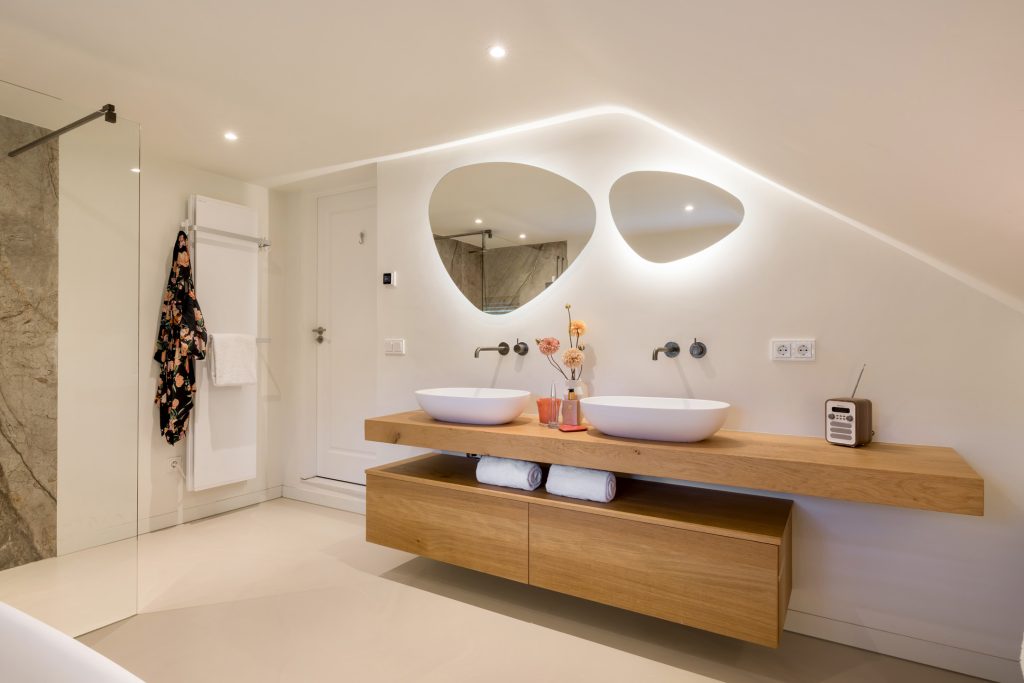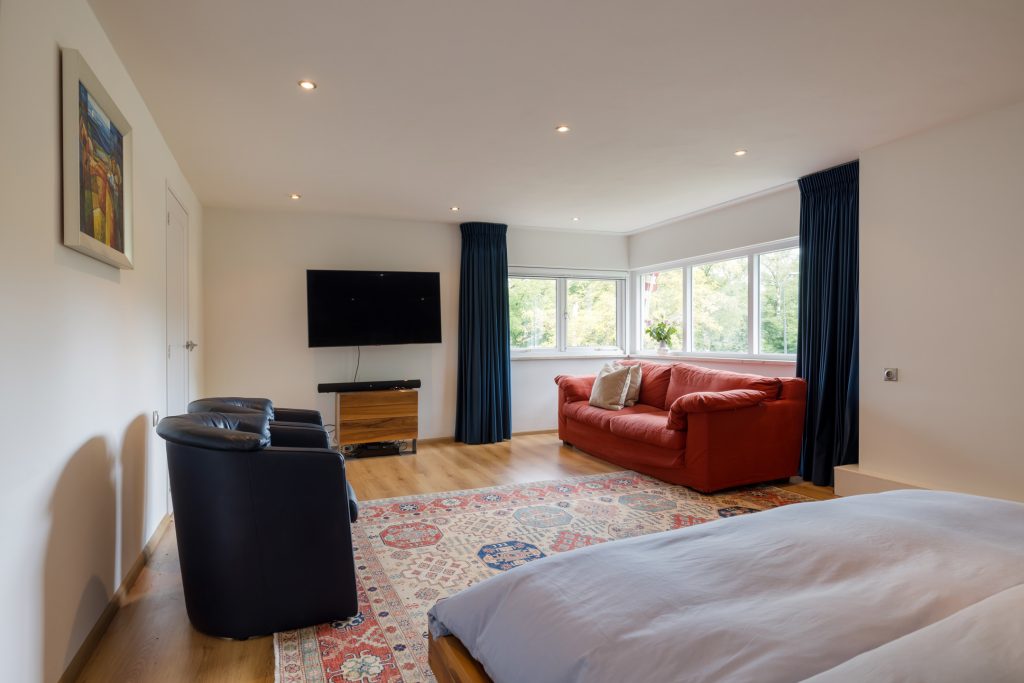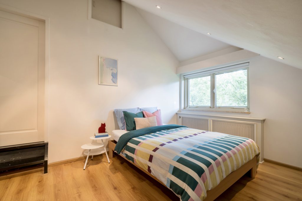 Op de verdieping bevinden zich drie ruime slaapkamers, twee moderne badkamers en een separate kleedkamer. De master bedroom aan de voorzijde biedt fraai uitzicht over het Eikenven. Een van de andere slaapkamers heeft toegang tot het balkon en uitzicht op de tuin. Indien gewenst is uitbreiding naar vijf slaapkamers mogelijk.