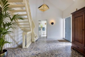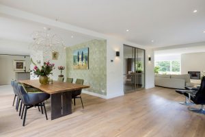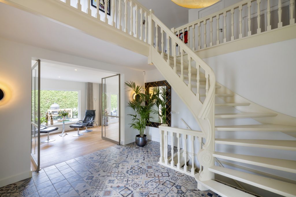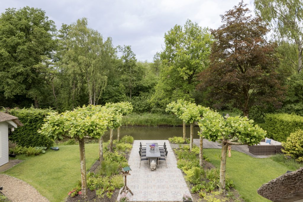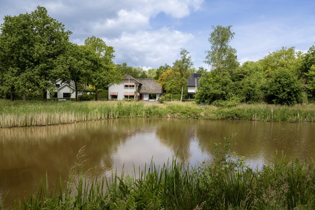 De representatieve entree biedt toegang tot een ruime hal met vide. Openslaande deuren leiden naar de woonkamer met uitzicht op het ven. De living is verdeeld in meerdere zitgedeeltes, waaronder een sfeervolle tv-ruimte en een eetkamer die in directe verbinding staat met de keuken.
