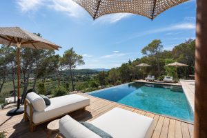 Buiten vormt het royale privézwembad van 70 m² het hart van het buitenleven. De ruime terrassen nodigen uit tot ontspanning, dineren en het optimaal genieten van het mediterrane klimaat en het indrukwekkende uitzicht over de vallei.