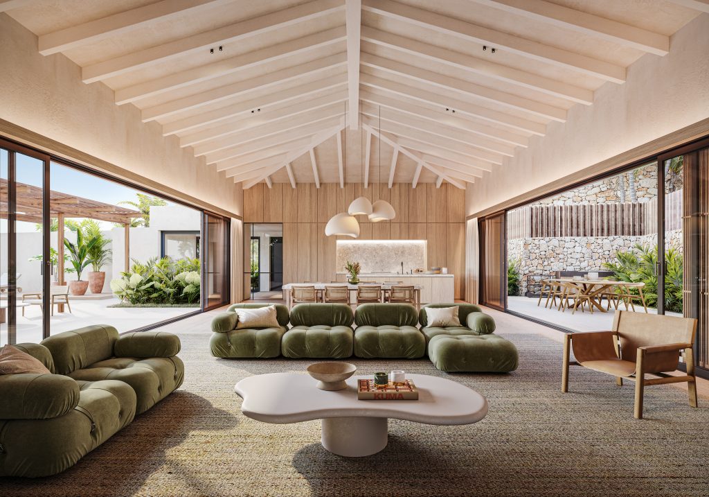 Het ontwerp van Casa Imagine B draait volledig om het mediterrane buitenleven. Grote glazen schuifpuien laten binnen en buiten naadloos in elkaar overlopen en creëren een open, ontspannen sfeer die perfect past bij het klimaat en de levensstijl van Ibiza. Een bijzonder architectonisch kenmerk is de indrukwekkende plafondhoogte van maar liefst 4,5 meter in de woonkamer, wat in combinatie met de warme houtlook afwerkingen zorgt voor een uitzonderlijk ruimtelijk en elegant gevoel. Zowel de constructie als de afwerking zijn uitgevoerd met hoogwaardige materialen en oog voor detail, wat resulteert in een woning die klasse, comfort en duurzaamheid uitstraalt. De open plattegrond biedt volop vrijheid om de leefruimtes naar eigen wens en stijl in te richten.