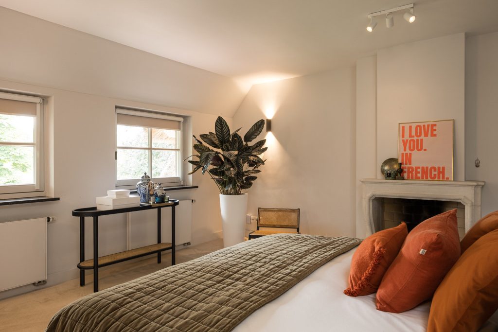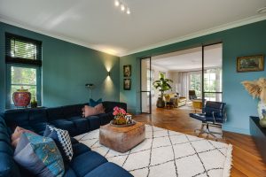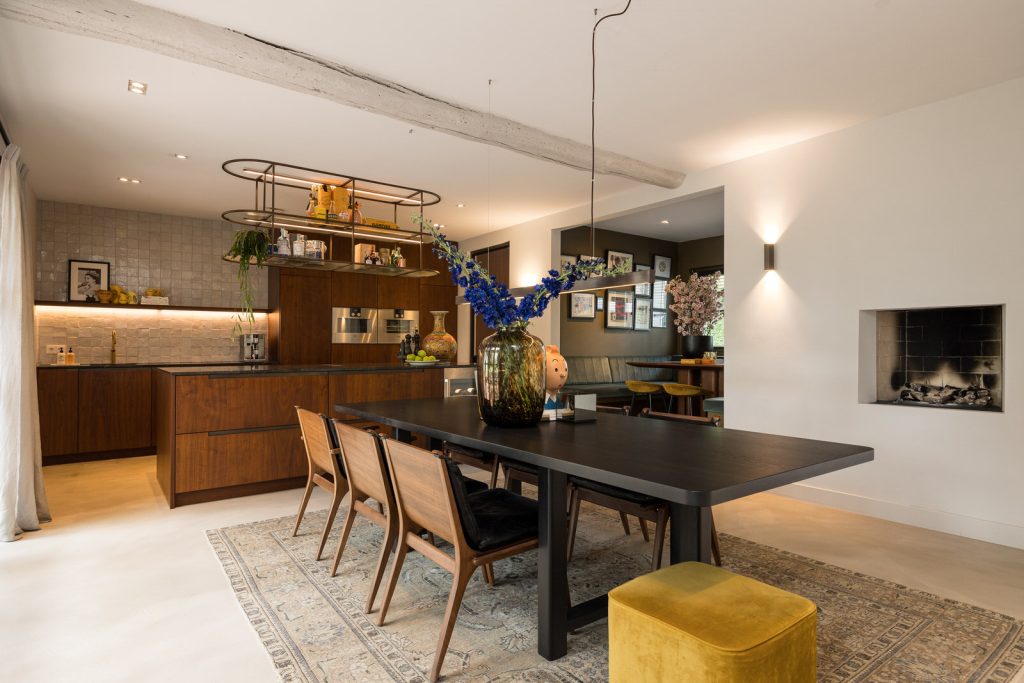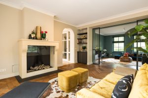 De living is warm en uitnodigend, met een eikenhouten vloer in visgraatmotief en een robuuste kalkzandstenen schouw. De indeling van de woning is praktisch en doordacht, met een werkkamer in de rechtervleugel, afgescheiden van de woonkamer voor optimale rust en privacy.