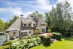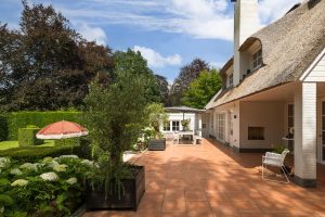 De garage biedt plaats aan twee auto’s en de omliggende tuin van 1.885 m² is een oase van rust en privacy, met gesnoeide taxuszuilen, rode beuken en diverse terrassen.