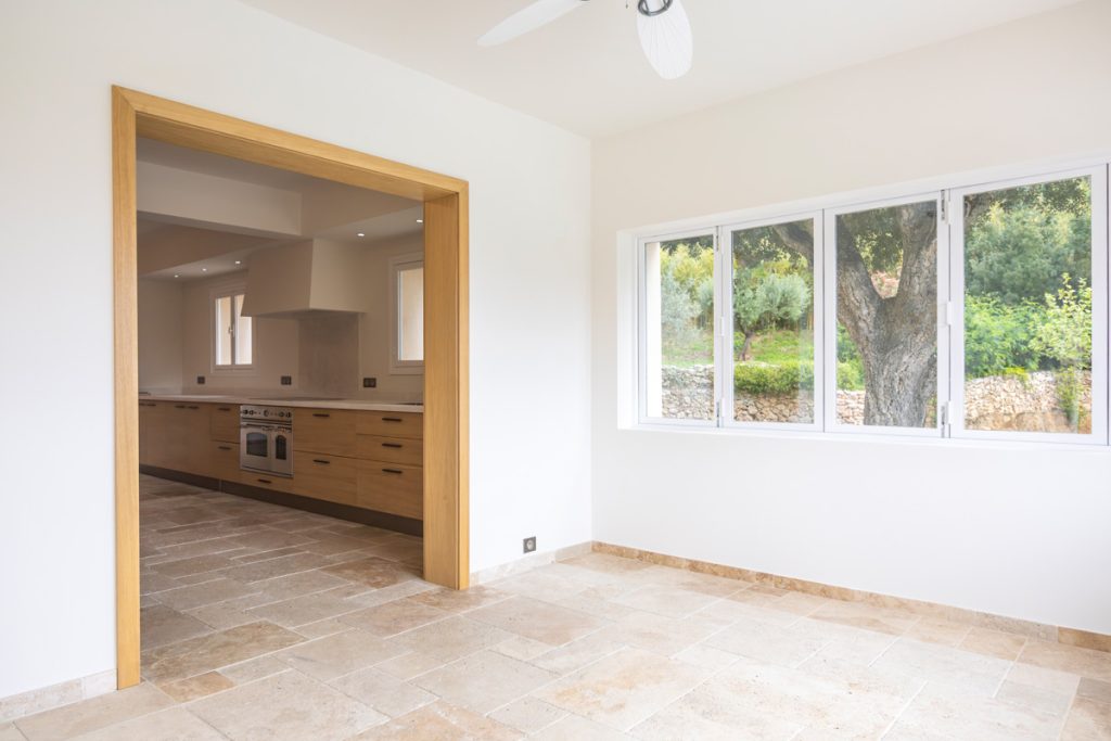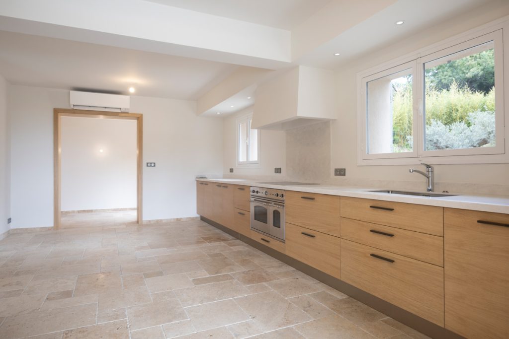 De keuken is ruim, licht en van alle gemakken voorzien. Deze ruimte communiceert open met de eetkamer en de woonkamer. Beide bieden een spectaculair uitzicht op de tuin, het zwembad en de azuurblauwe zee.