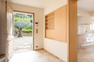 De entree van deze villa (ca. 195 m²) bestaat uit een royale hal met op maat gemaakte kasten.