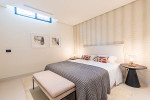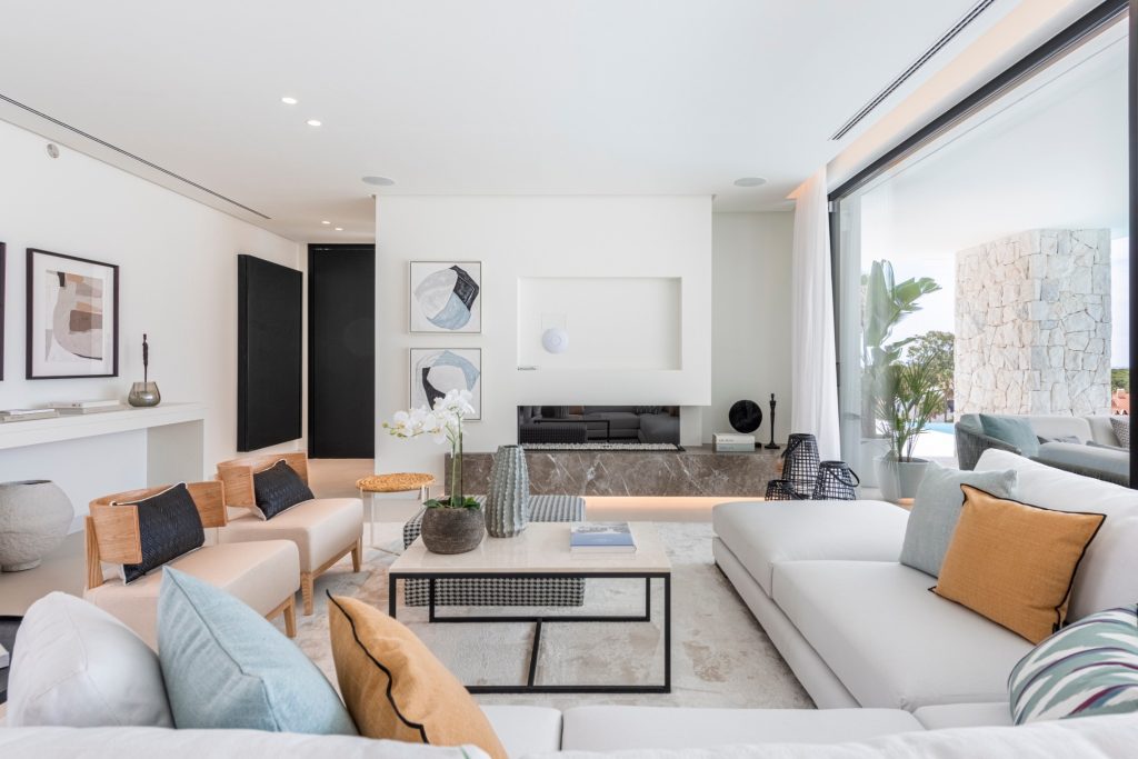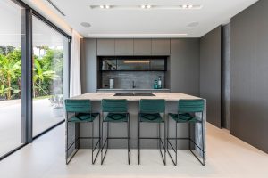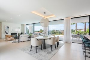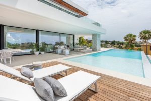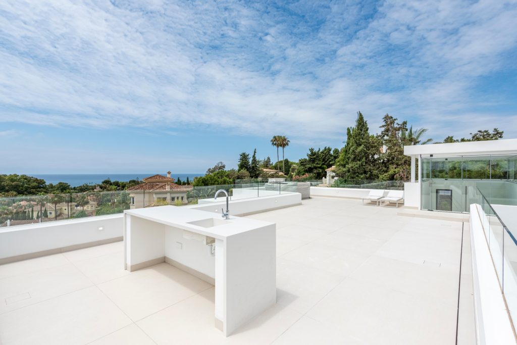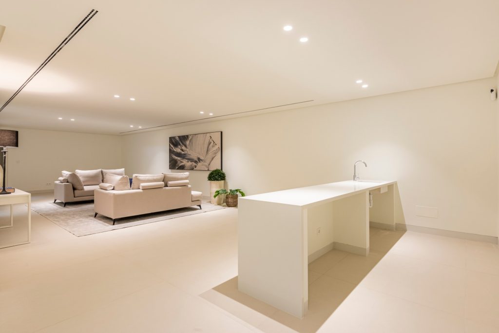 De woning is ontworpen door de bekende lokale architect Carlos Lamas en biedt comfortabele accommodatie over 4 niveaus, inclusief kelder en solarium. Het ingangsniveau omvat een gastentoilet, een lounge/eetkamer met open keuken, volledig uitgerust met Gaggenau-apparatuur en een centraal eiland. De lounge leidt naar het gedeeltelijk overdekte terras met zwembad en royale ruimtes om te zonnebaden, buiten te dineren en te ontspannen.