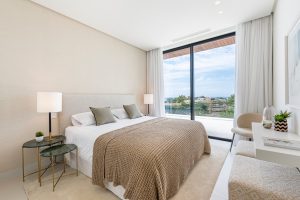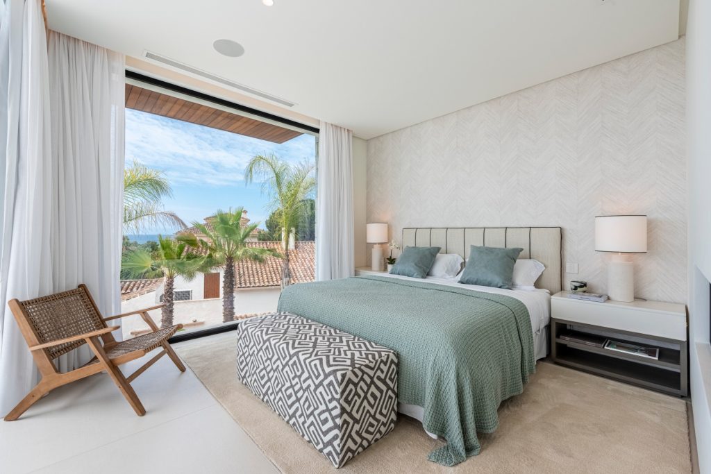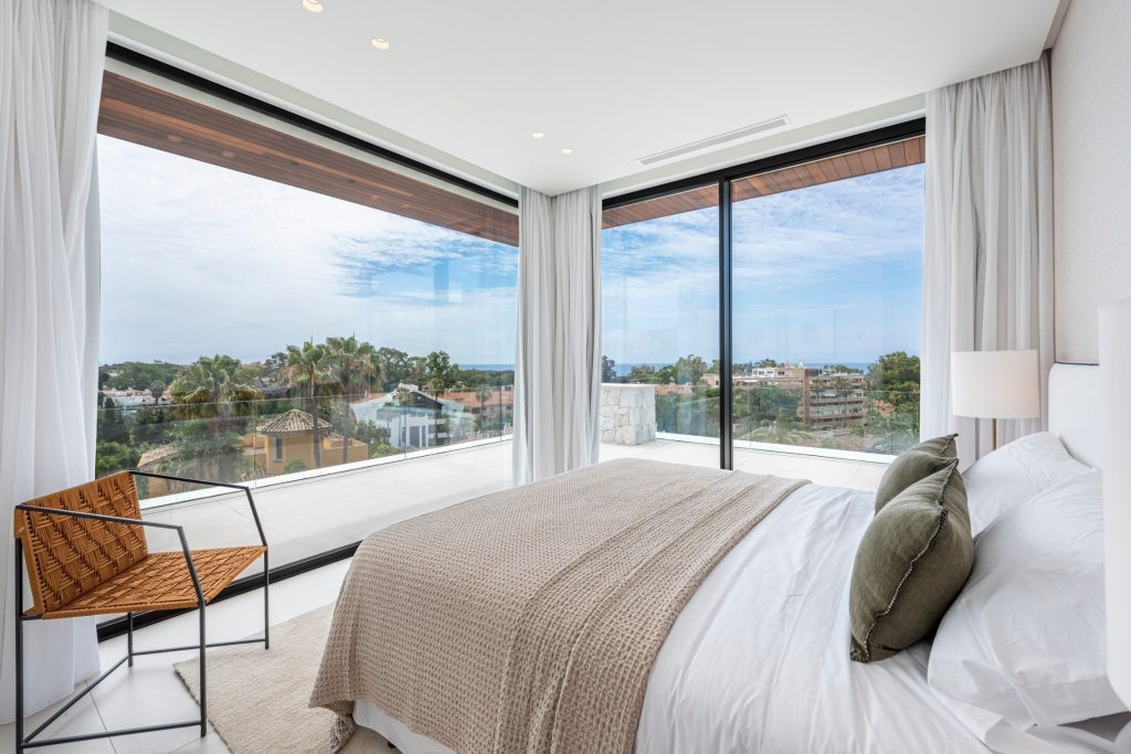 De bovenverdieping herbergt 3 slaapkamers, allemaal met toegang tot het open terras met uitzicht op zee. Bovendien beschikt de master bedroom over een open haard, een bad en een douche.