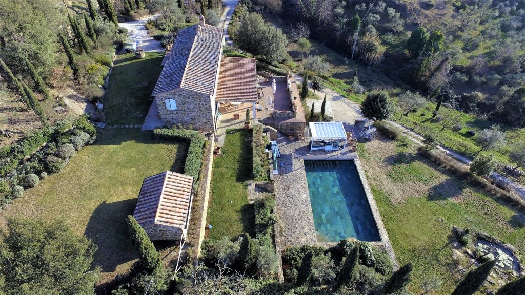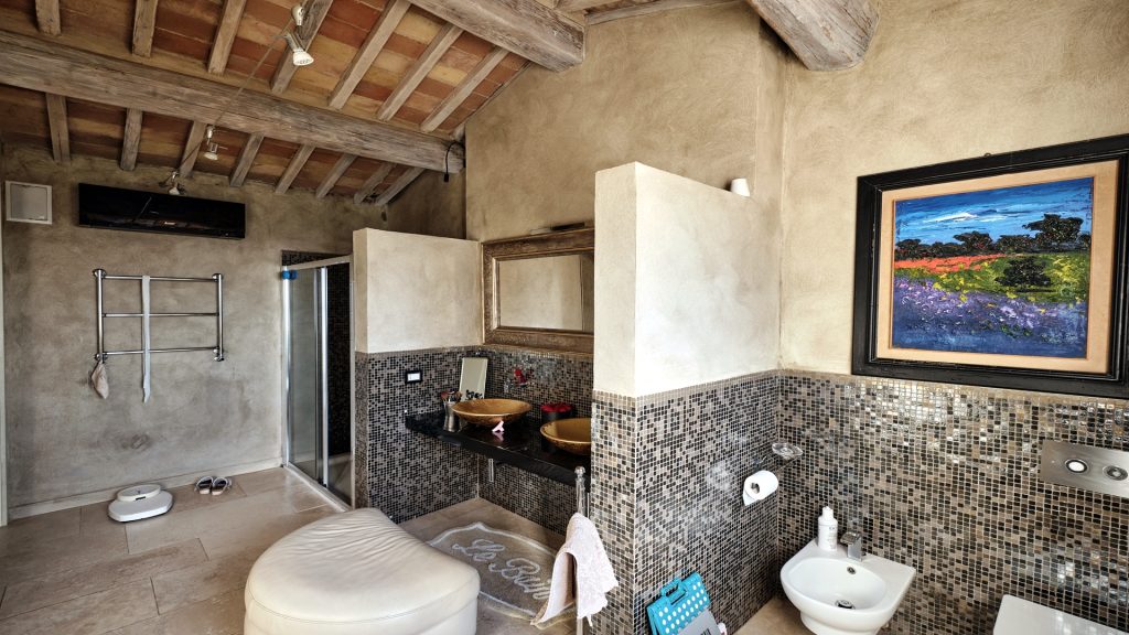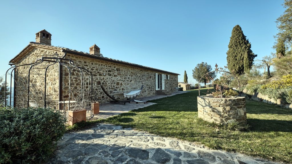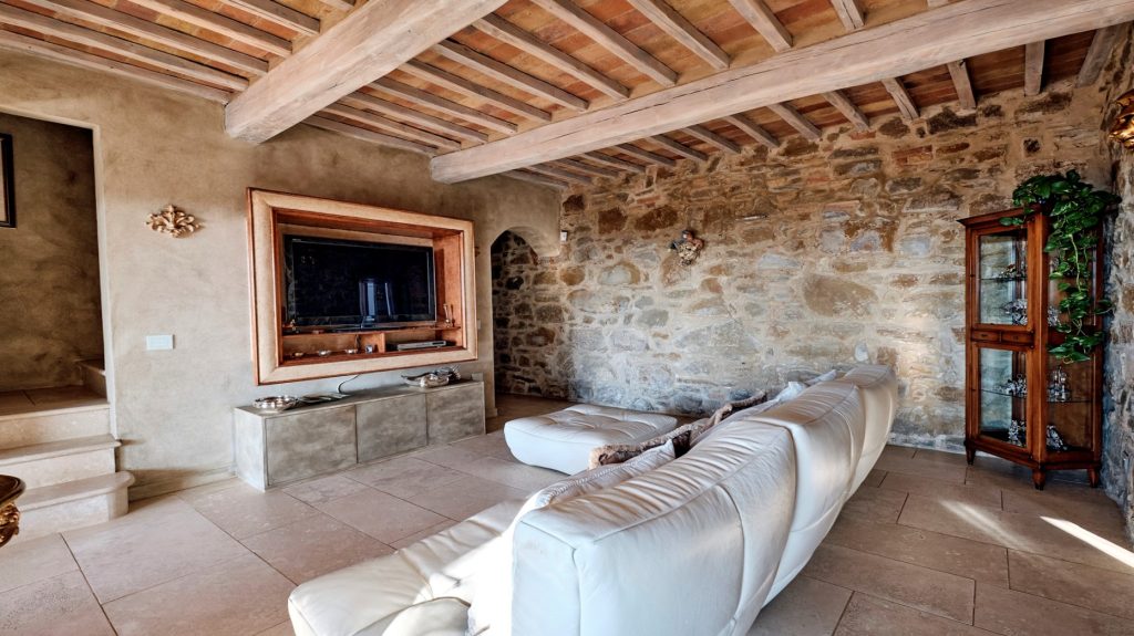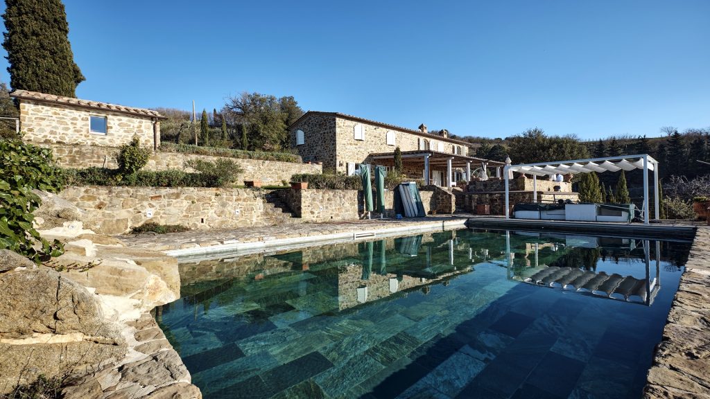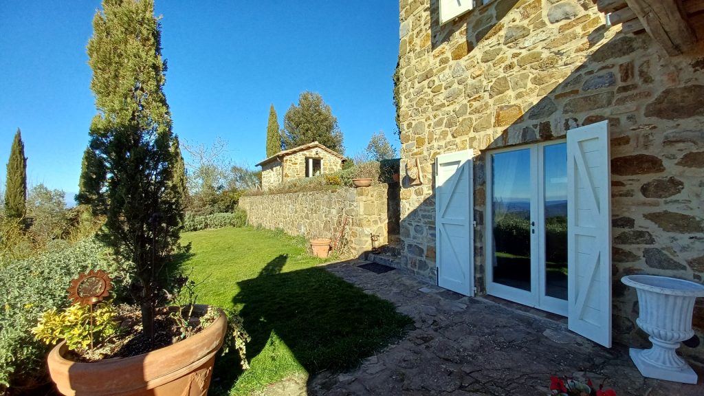Stap binnen in deze prachtig gerenoveerde boerderij en je zult meteen onder de indruk zijn van het elegante ontwerp en de aandacht voor detail. Het landhuis, dat ongeveer 300 vierkante meter beslaat en verdeeld is over drie verdiepingen, biedt een naadloze mix van modern comfort en traditionele Toscaanse charme. Op de middelste verdieping bevindt zich het woongedeelte, met een ruime keuken met een centraal eiland, een badkamer, een eethoek en een dubbele woonkamer met open haard, gescheiden door een prachtige stenen boog. Elke kamer op deze verdieping biedt toegang tot een groot terras met prachtig uitzicht op de omliggende heuvels en een pittoresk zwembad compleet met een prachtige stenen waterval en een zonovergoten solarium met een prieel.