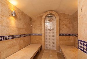 Prachtige wellness-ruimte met douche, toilet, vestiaire, een hammam in Marrakesh-stijl en een mooie mozaïek-jacuzzi op het terras met uitzicht over de tuin.