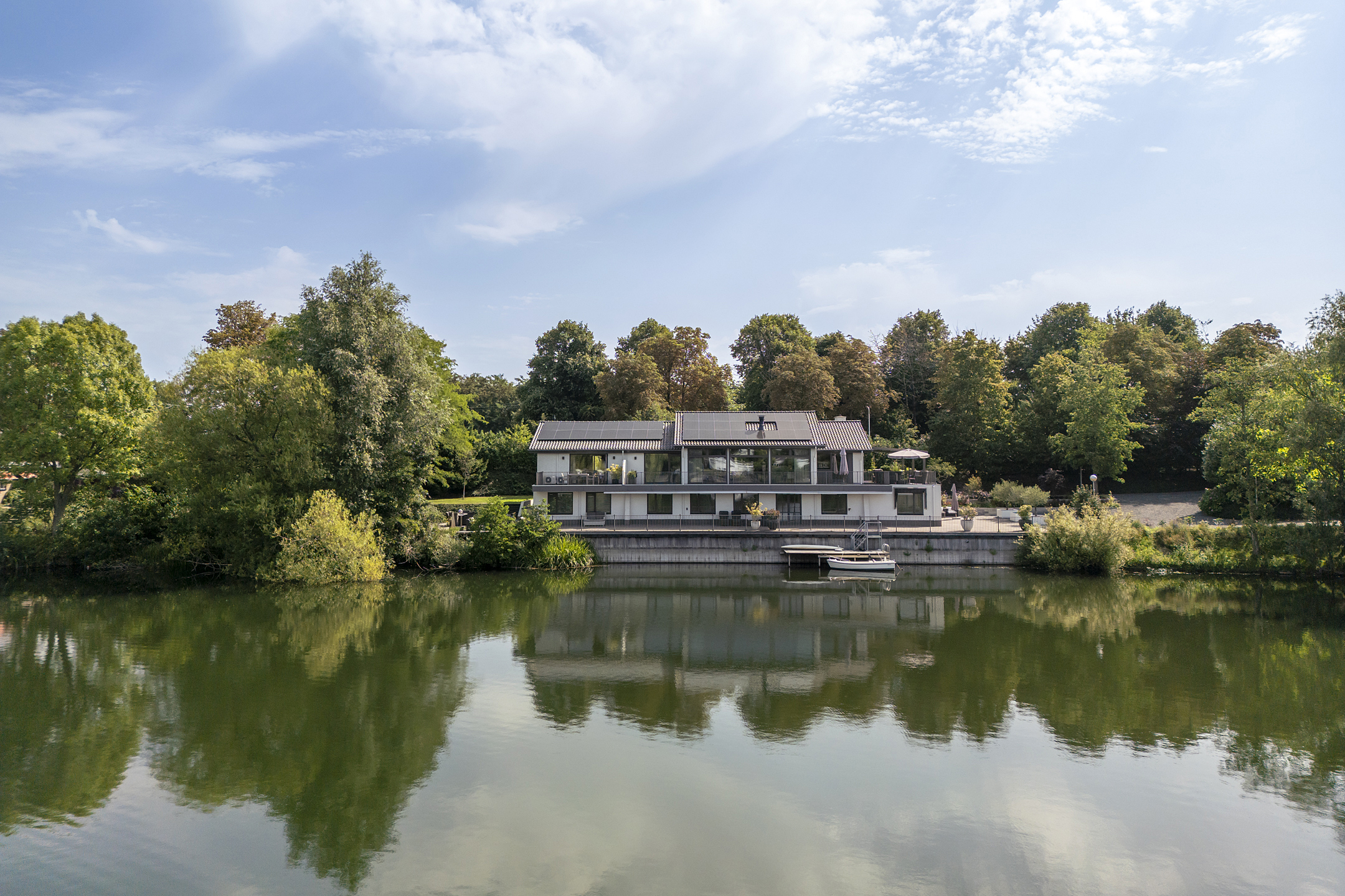 On the garden side lies a 40-meter quay with two licensed jetties. Step into your whisper boat, take a refreshing swim, or simply enjoy the tranquility of the waterfront. The mature garden, double gate, and laurel hedges provide optimal privacy.