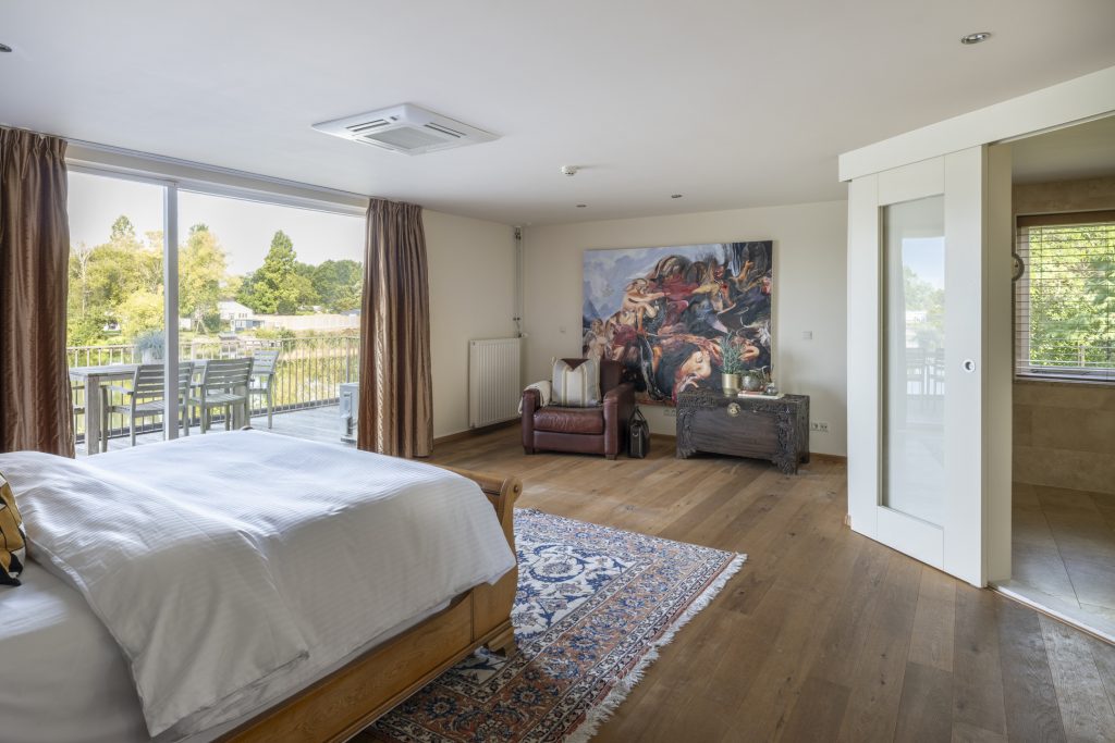 Met meerdere riante slaapkamers en badkamers biedt de villa ruimte voor een groot gezin of gasten. De master suite, met eigen badkamer en dressing, kijkt uit over het water, een uitzicht dat u nergens anders in Nederland zo vindt. Ook gasten worden in de watten gelegd met veel privacy.