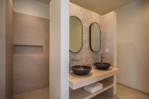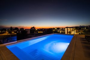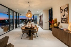 Glazen schuifdeuren en ramen omzomen het overdekte terras, waardoor de hele tweede verdieping volledig uitzicht en buitengewone zonsondergangen heeft over Vista Royal. Buiten zitten, dineren en ruimte voor loungebedden vindt u op het zwembadterras van 90 m² plus.