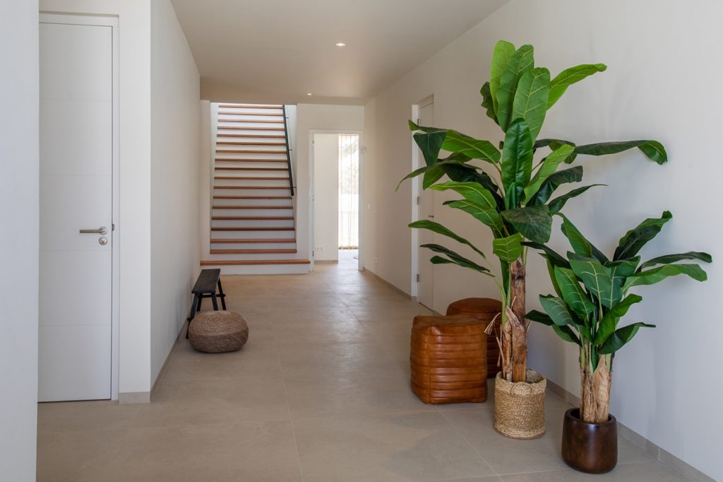 Een elektrische poort en toegangsdeur openen respectievelijk naar de verharde parkeerplaats en het betegelde pad. Graven en palmbomen verwelkomen je bij de S-vormige gevel van de villa. Eenmaal binnen liggen aan de linkerkant vier slaapkamers met eigen badkamer, elk met eigen douchecabine, dubbele wastafel en apart toilet. Aan de rechterkant is de resterende slaapkamer, gelijkaardig in stijl, ook met ingebouwde kast en schuifdeuren naar de tuin. Drie bergruimtes, een gastenbadkamer en toegang naar de achtertuin en de tweede verdieping bevinden zich allemaal in de gang.